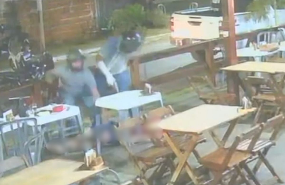 O vídeo da câmera de segurança do estabelecimento mostra que a vítima estava sentada com parentes, próximo da rua, na noite de 7 de setembro de 2024.